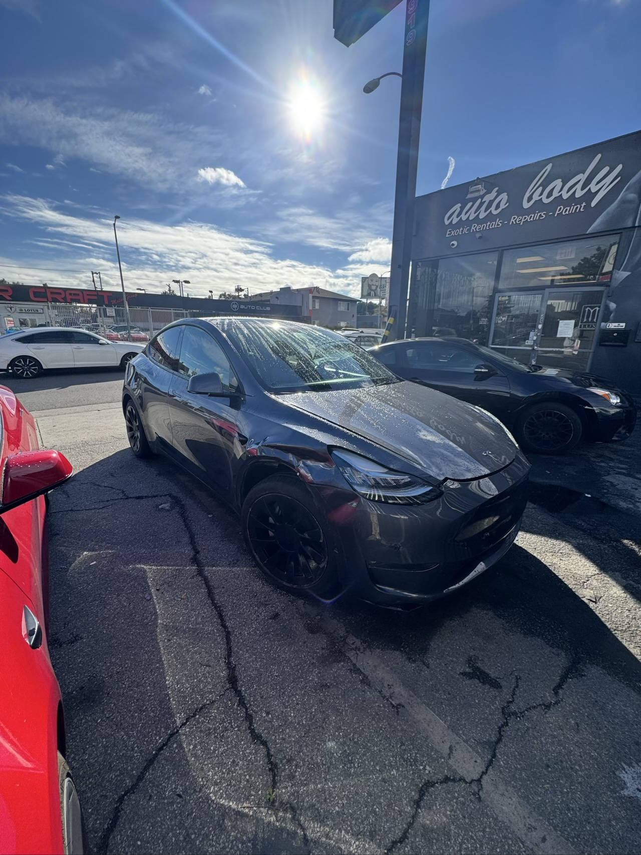 This Tesla Model Y came in with front-end collision damage requiring bumper, hood, and fender work. Despite the 25-day total shop time due to Allstate's claims process, our team completed the actual repairs in just 10 days. Using Tesla-certified parts and precision color-matching on the Midnight Silver Metallic paint, we restored this EV to factory condition with all sensors and cameras properly recalibrated.
